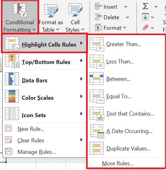 Highlight Cell Rules are the most commonly used option within Conditional Formatting. They allow you to apply formatting rules to cells that meet specific conditions or comparisons.